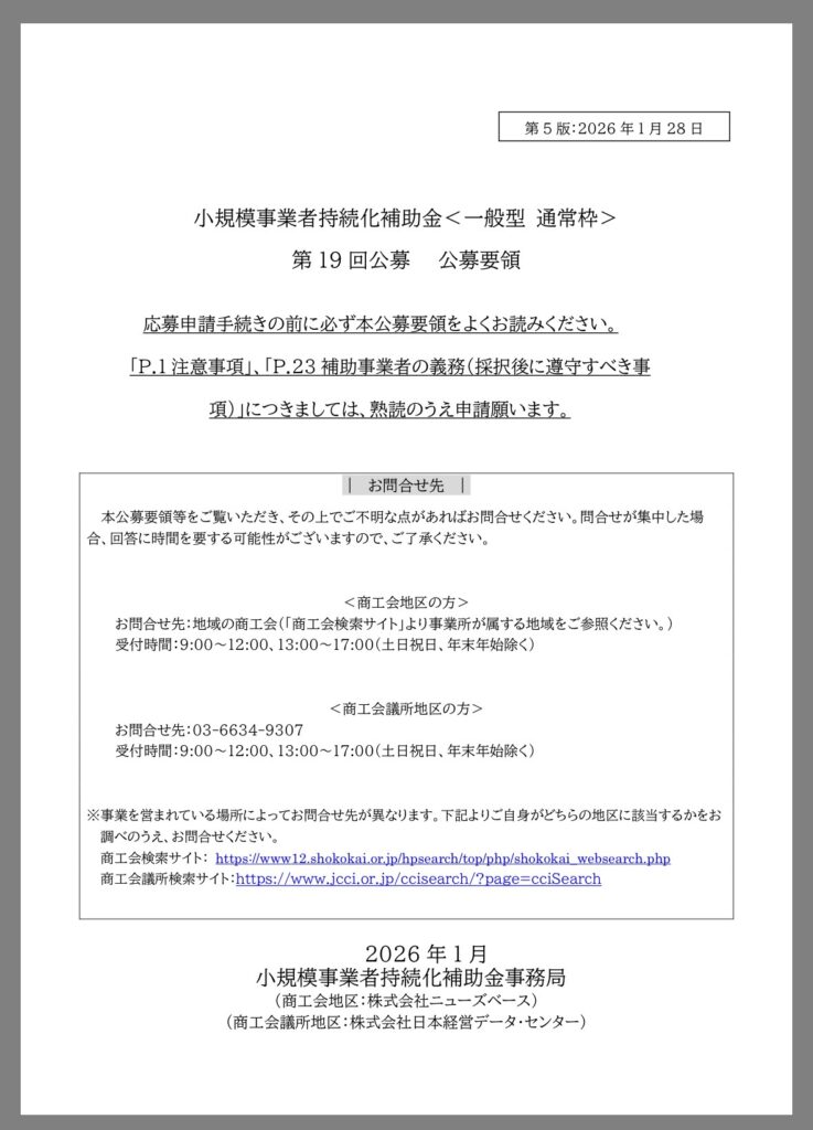 | お問合せ先 | 【小規模事業者持続化補助金事務局】 <商工会地区の方> お問合せ先:地域の商工会(「商工会検索サイト」より事業所が属する地域をご参照ください。) 受付時間:9:00~12:00、13:00~17:00(土日祝日、年末年始除く) <商工会議所地区の方> お問合せ先:03-6634-9307 受付時間:9:00~12:00、13:00~17:00(土日祝日、年末年始除く) |