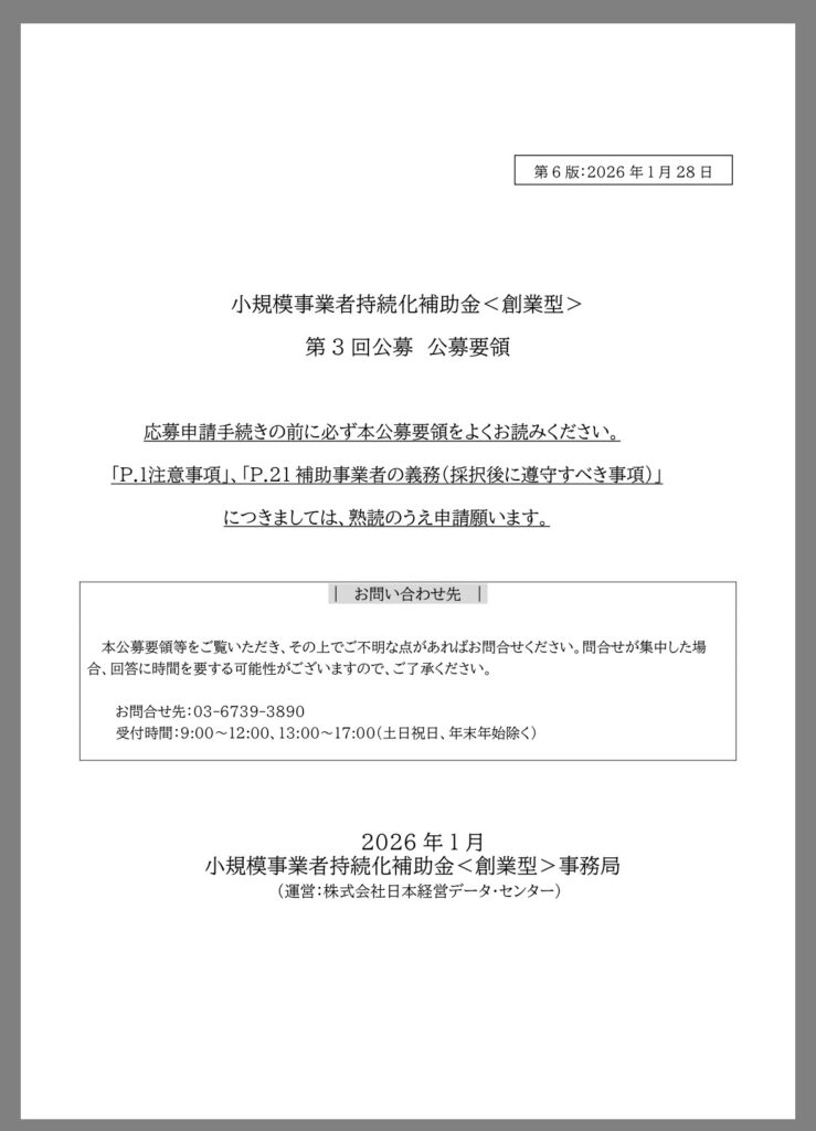 | お問合せ先 | 【小規模事業者持続化補助金<創業型>事務局】 運営:株式会社日本経営データ・センター TEL:03-6739-3890 (受付時間 9:00~12:00、13:00~17:00) ※ 土日祝日、年末年始の休業日を除きます。 ※ お電話番号をお間違いのないようお願いいたします。 ※ お電話には通話料金がかかります。 |