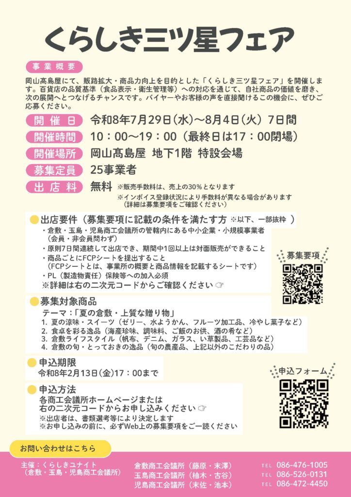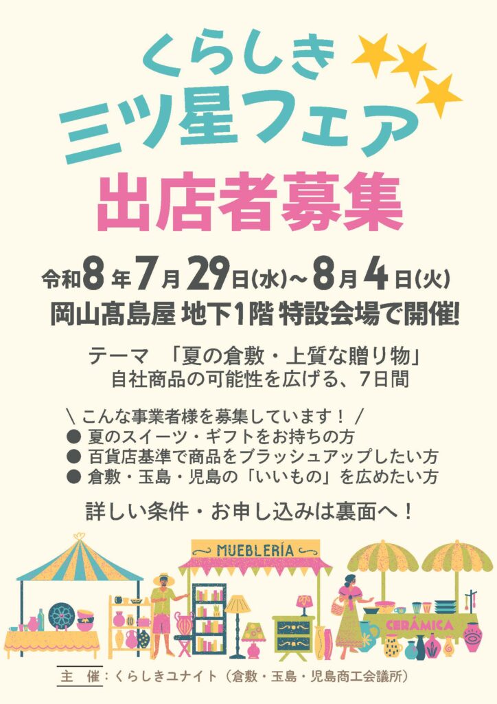 | 申し込み先 | くらしき三ツ星フェア出店申込フォーム |