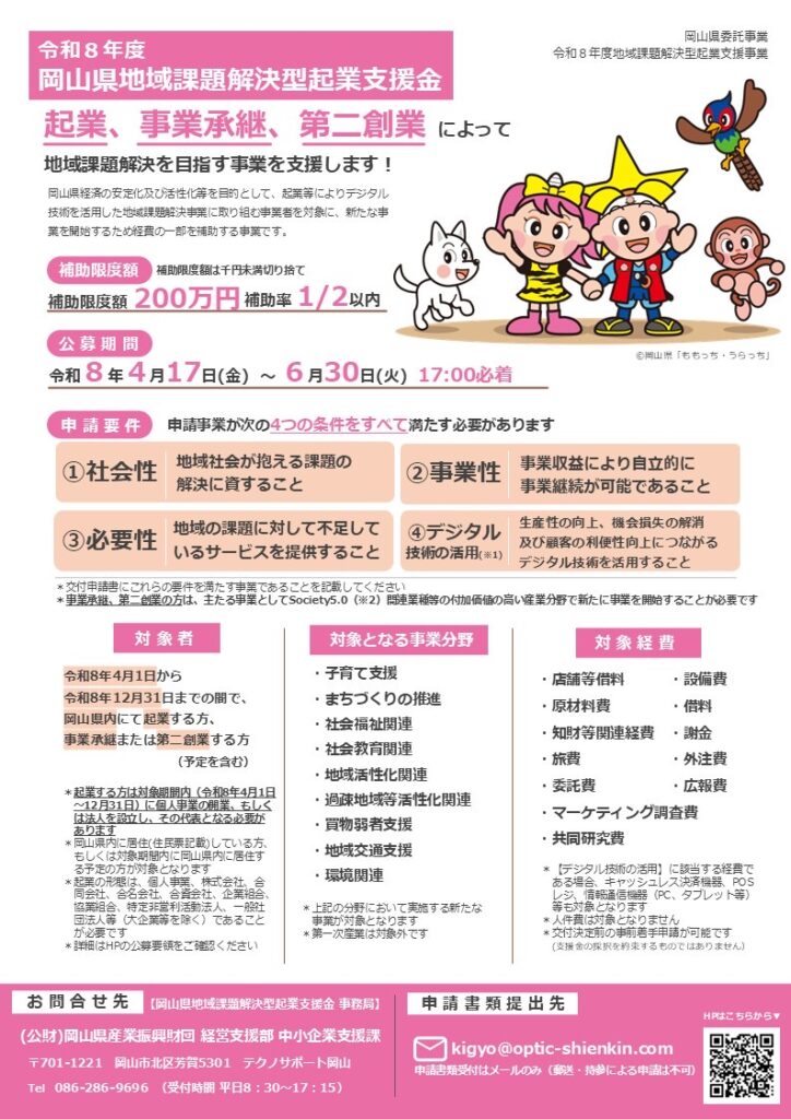 対象者令和8年4月1日から令和8年12月31日までの間で、岡山県内にて起業する方、事業承継または第二創業する方(予定を含む)